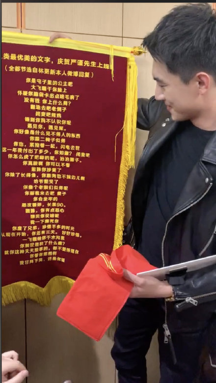 11月18日,林更新来优酷扫楼过程中,惊现粉丝送锦旗,内容全部是林更新曾经自己的微博评论,画面十分搞笑。