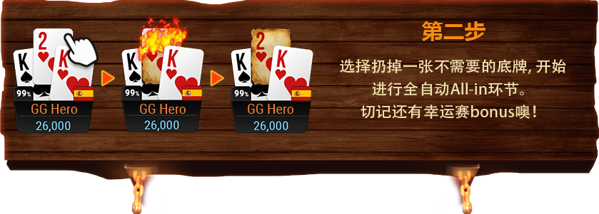 玩家报名参加比赛后,首先进入自动全押阶段。在本阶段,玩家将获得3张手牌,自选任意1张舍弃后全押。全押阶段每张牌桌最终的胜出者将进入钱圈。