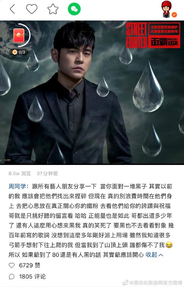 周杰伦发文称:“跟所有艺人朋友分享一下,当你面对一堆黑子,其实以前的我应该会把他们找出来捏碎,但现在真的别浪费时间在他们身上,去把心思放在真正关心你的铁粉,去看他们给你的夸赞与祝福。”还调侃称:“哥就是只挑好听的留言看。”最后更是霸气怼黑粉:“哥都出道多少年了,还有人这么用心想来黑我真的笑死了,要黑也不去看看对象。几百年前写的歌词,没想到这么多年刚好派上用场,虽然我知道很多弓箭手想射下往上爬的我,但当我到了山顶上头,谁都伤不了我。所以如果爷到了80还是有人黑的话,其实爷应该开心!”