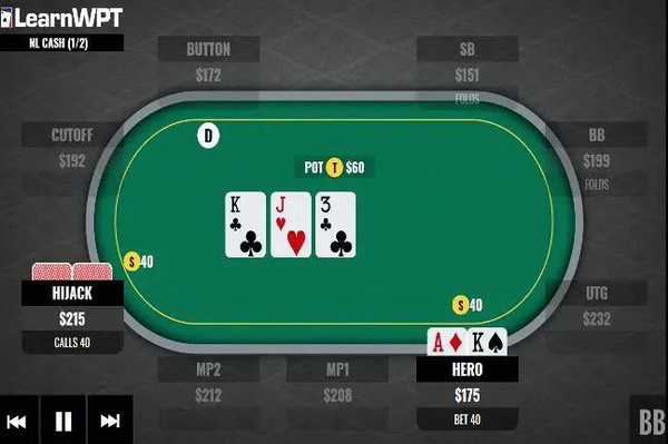 这手牌来自一个盲注1/2美元的无限德州美天炸金花常规局。桌上玩家筹码量如图所示。翻前,你在前面位置用A♦K♠率先加注到15美元,劫位玩家、小盲玩家和大盲玩家跟注。翻牌是K♣J♥3♣,底池现在有60美元。大小盲玩家check,你下注40美元,只有劫位玩家跟注。转牌是3♣。底池现在有140美元。你下注55美元,劫位玩家全压215美元,现在轮到你行动……你会如何行动?跟注还是弃牌?