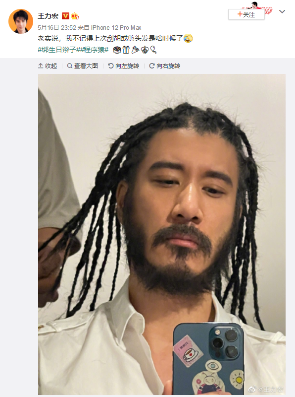 王力宏在16日深夜于微博更新近况,即将在17日度过45岁生日的他,久违地晒出一张超近自拍,只见他穿着白色衬衫,眉头深锁地对着镜子拍照,一头黑色颓废长发,长到可以绑成一根根细长辫子,下巴与嘴巴周边长满浓密、茂盛的胡须渣,加上健康的小麦肤色,比先前更升级的粗旷、狂野造型瞬间吸引大批网友的目光,他还配文“老实说,我不记得上次刮胡或剪头发是啥时候了”。