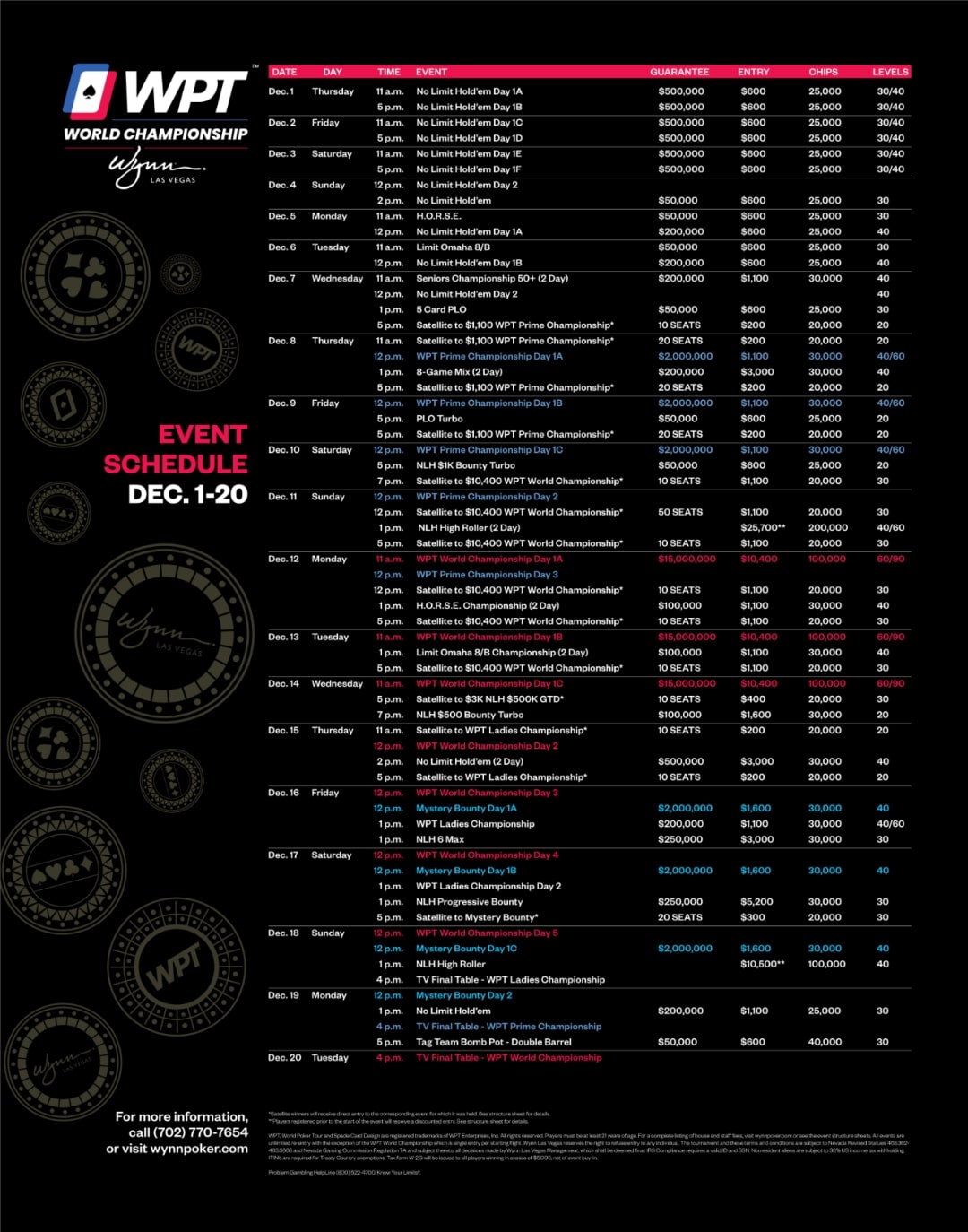 以下是赛事的完整赛程表:【EV扑克】现场锦标赛之最!WPT携手永利,推出1500万刀保底主赛