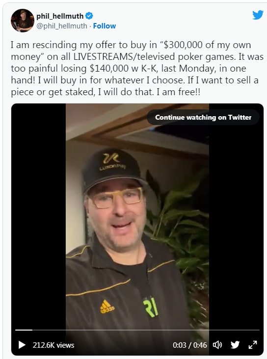 大高个Hellmuth可是个机灵人,为了钱包豁出去了,他在Twitter上宣布:我放弃30万刀上桌的承诺了,一手KK让我输掉14万刀,这太TM心痛了。以后我想买多少就买多少,我想卖股份就卖,想拉赞助就拉,这是我的自由!