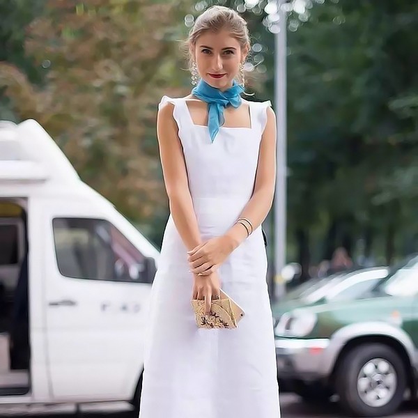 一袭棉麻白裙清新大方,裙子的方领与荷叶边宽肩带呼应显得复古时尚,亮色丝巾、大耳坠提升整体质感让造型脱颖而出,打破单调充满艺术气息。
