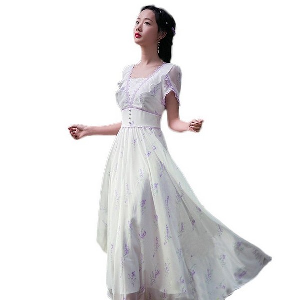 大方领小白裙也很值得pick,露出肩颈帮助显瘦,领形剪裁衬托复古文艺气质,宽大的荷叶袖能拯救粗壮手臂,但也容易显魁梧,适合窄肩小胸妹驾驭。