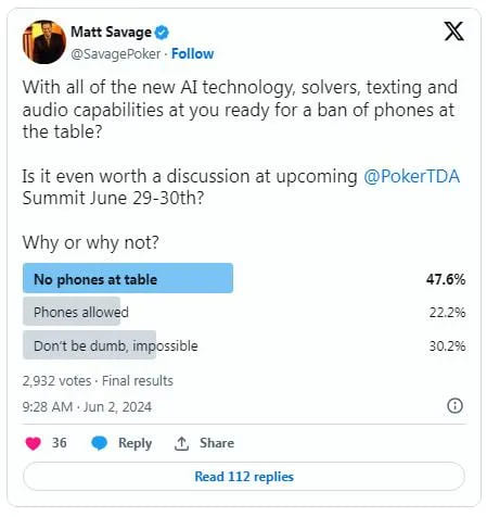 著名赛事总监Matt Savage通过 X 上的投票提出了这一可能性,询问是否值得在月底举行的下一次赛事总监协会会议上讨论手机禁令。近3,000人参与了投票,结果喜忧参半,但仍有近 50%的人主张禁止使用手机。