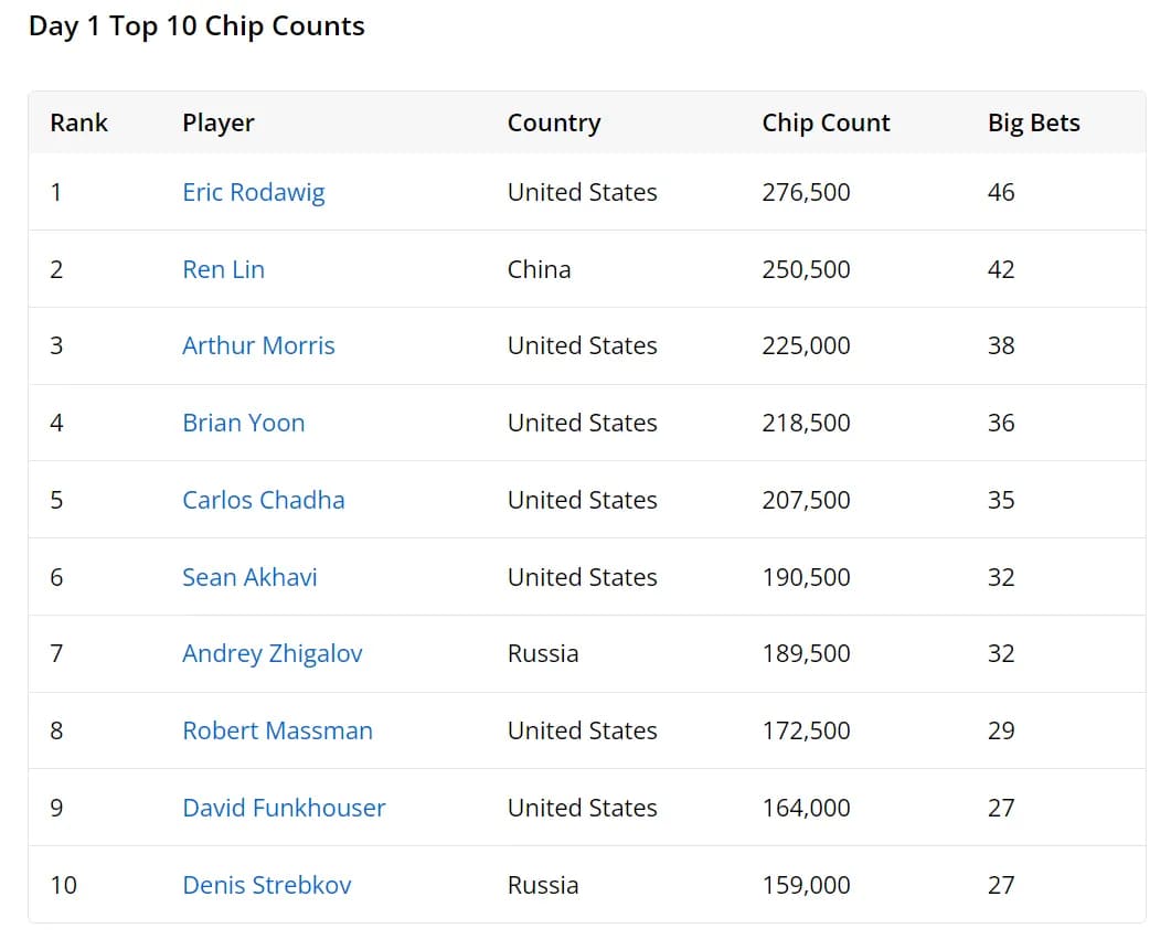 这场买入10000刀的雷斯(玩法和七张牌梭哈类似,只不过是低牌牌组获胜)在Day 1吸引了101人参赛,当天比赛结束时剩余53人晋级,封袋时中国选手Tony Lin(Ren Lin)筹码量全场第二。李银桂也在该比赛晋级。