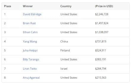 中国选手王阳在与Eldridge的对抗中败下阵来,获得了第四名及731,819美元奖金的成绩。